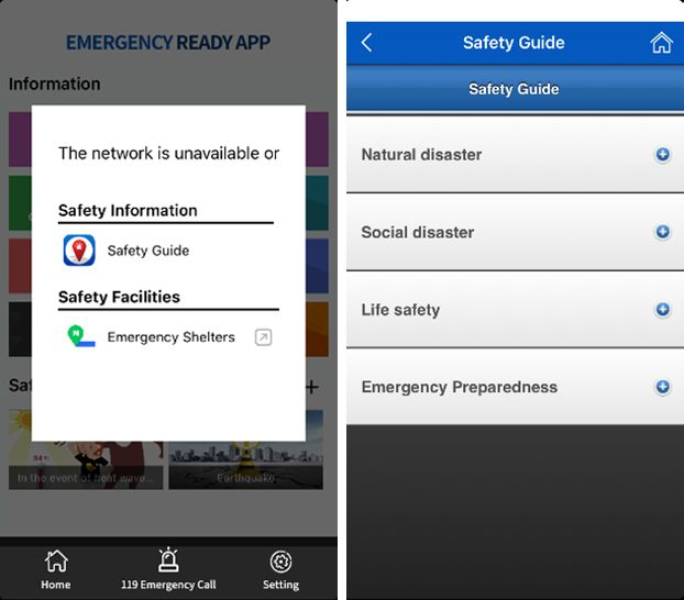 Mt der App „Emergency Ready“ könnt ihr bei Natur- und Sozialkatastrophen und verschiedenen Sicherheitsunfällen Anweisungen darüber finden, wie ihr euch in dieser Situation verhalten solltet. Die App ist in 14 Sprachen verfügbar, bei Notfällen werdet ihr mit dem Notfalldienst 119 verbunden. Derzeit kann die App nur im Offline-Modus genutzt werden, weshalb die Lagen von Krankenhäusern, Feuerwachen etc. nicht angezeigt werden.